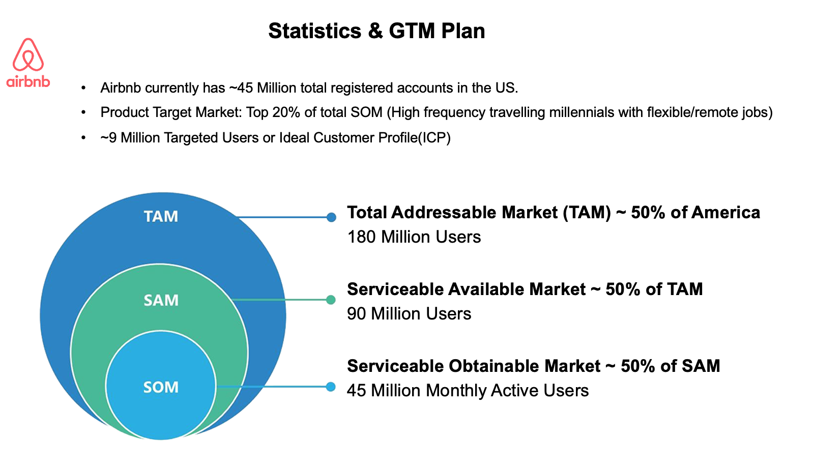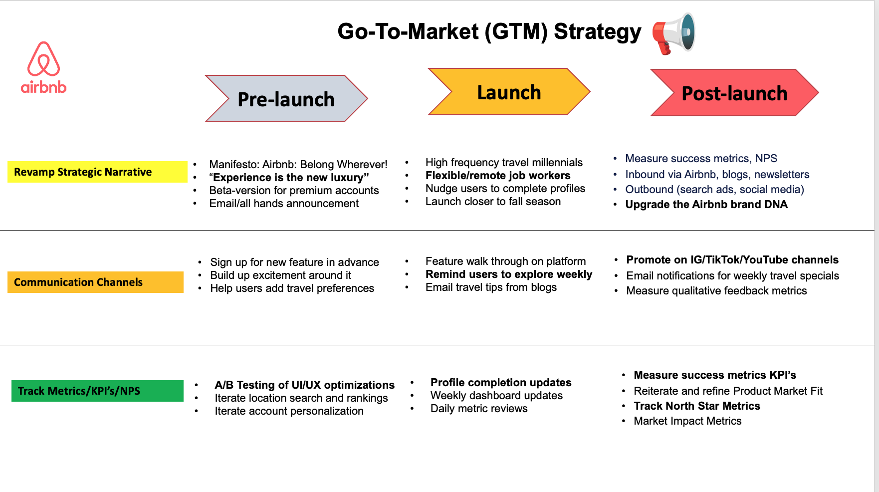 The more users start to discover this novel feature, the more data points for clustering, filtering, and trend analysis using Airbnbs’s algorithms to have personalized travel suggestions. The success of Airbnb is primarily rooted in the supply and demand of the available stays, so the higher the nightly occupancy the better the company’s growth. The North Star Metric(NSM) will be the occupancy rate across the available postings. It’s a logically metric which predicts the product’s success. Other KPIs and success metrics are listed through the funnel in the GTM strategy section of the blog.