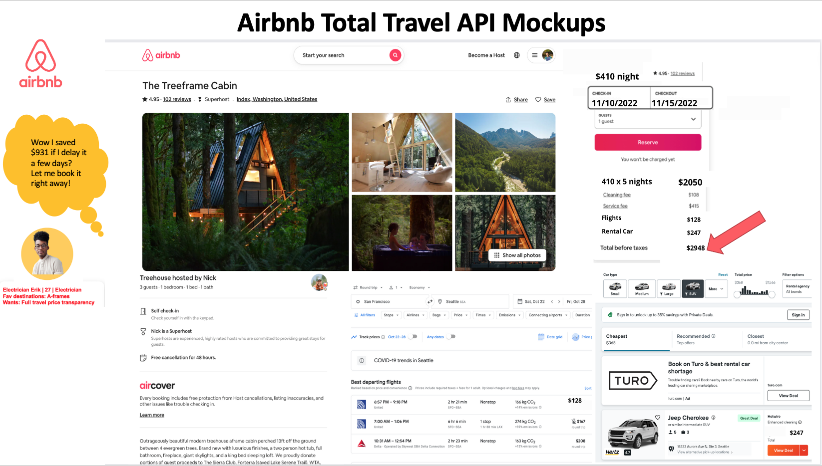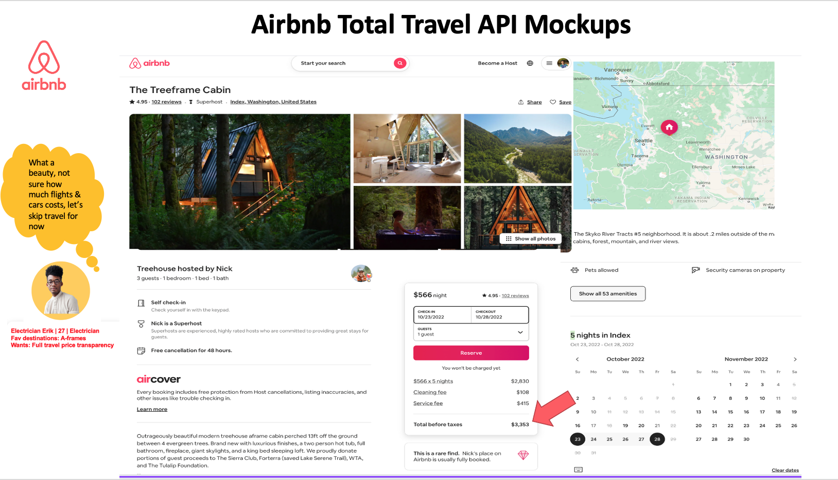 My hypothesis for choosing the Total Travel API with Maps/Flights/Rental cars is primarily rooted in customer empathy and the pain points it’s able to resolve with the value it delivers to the users holistically. For each destination a user wants to travel to, it takes them away from the Airbnb platform to engage their attention elsewhere which becomes the seminal action for the bookings on Airbnb. Not only are their efforts duplicated over and again across multiple locations and dates, but that’s also the time that could have been spent more on Airbnb for more discovery leading to more trips in the future.