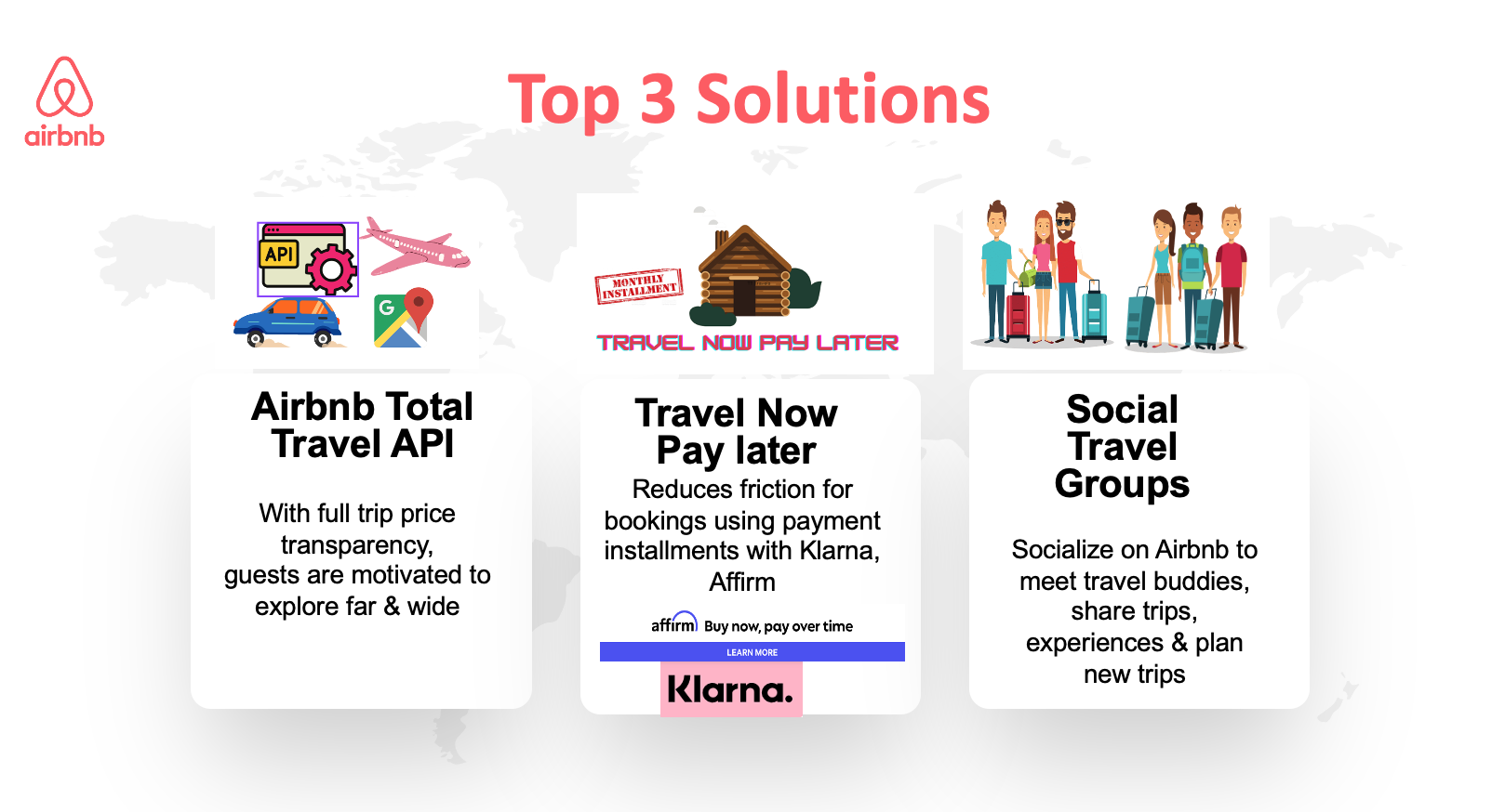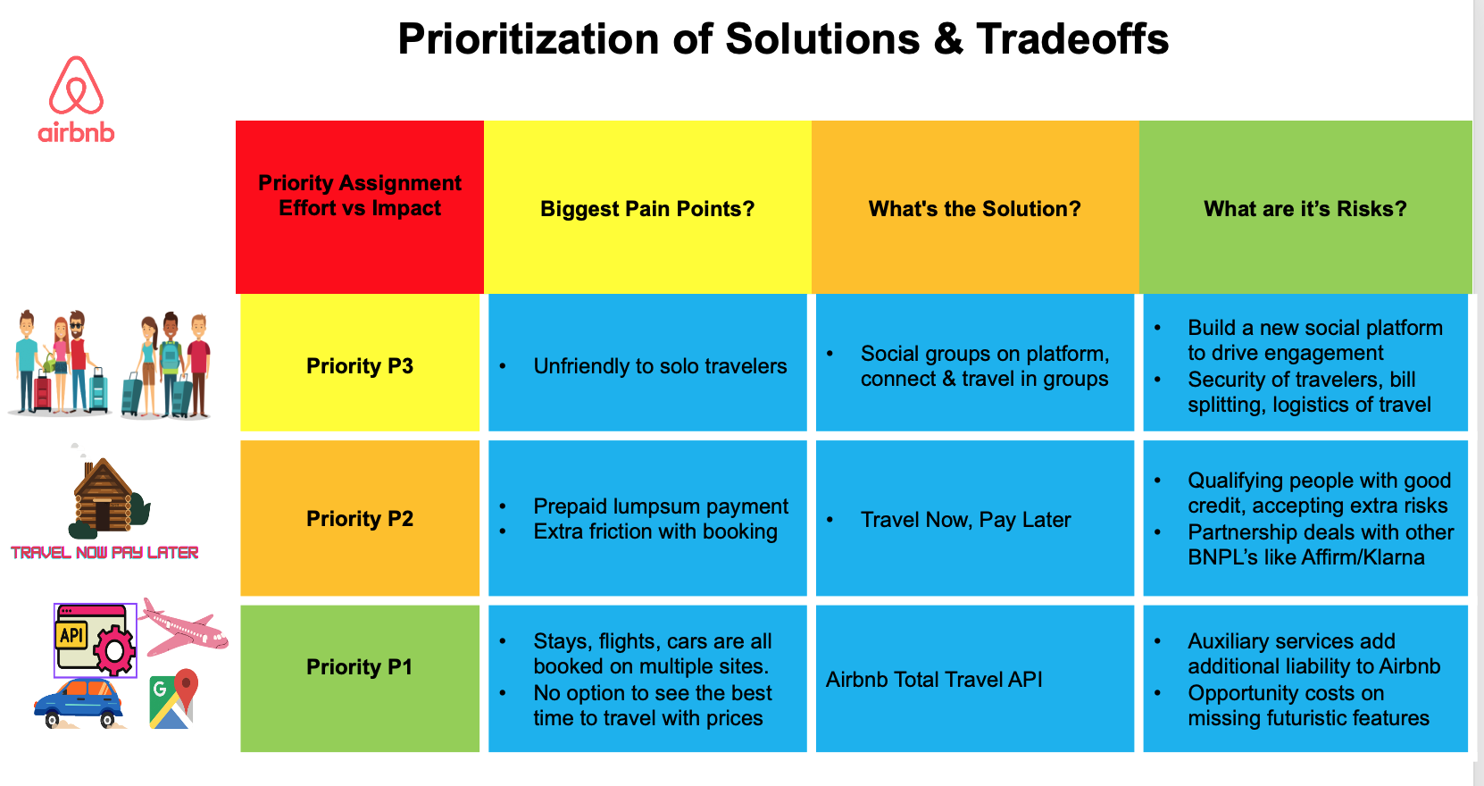 Out of all the viable solutions, Total Travel API and TNPL has bubbled up as the top solution through my framework and analysis. Airbnb by evolving its UVP with end-to-end travel boosted features could draw more users to the top of the funnel which increases the probability of booking success rates. While there could be some anticipated friction with a few user segments with privacy worries across end-to-end travel and payments, when addressed well it can be put away, but the idea does have merit and long-term potential when strategically implemented.